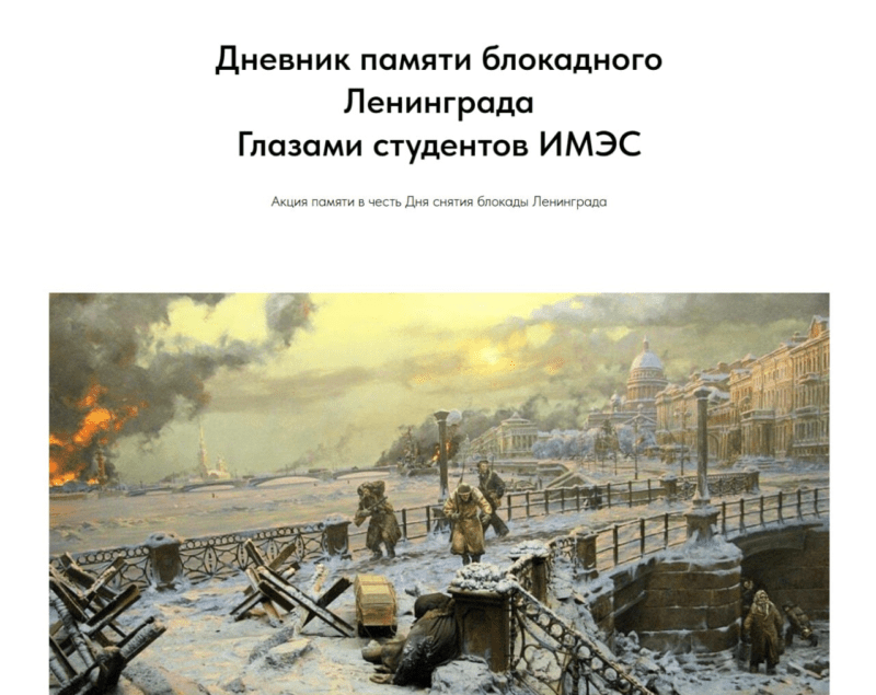 К 82-й годовщине полного освобождения Ленинграда от фашистской блокады студенты очно-заочной формы обучения Института международных экономических связей создали масштабный цифровой проект – «Дневник памяти блокадного Ленинграда. Глазами студентов ИМЭС».