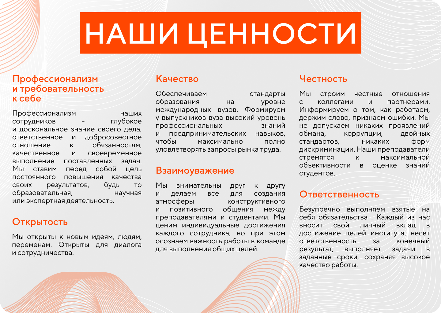 Ценности ИМЭС — это не просто про обучение. Мы создаём среду, в которой качество, профессионализм, ответственность, открытость и взаимоуважение становятся основой каждого учебного и рабочего дня.