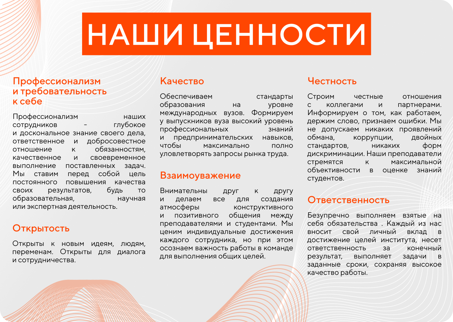 Ценности ИМЭС — это не просто про обучение. Мы создаём среду, в которой качество, профессионализм, ответственность, открытость и взаимоуважение становятся основой каждого учебного и рабочего дня.