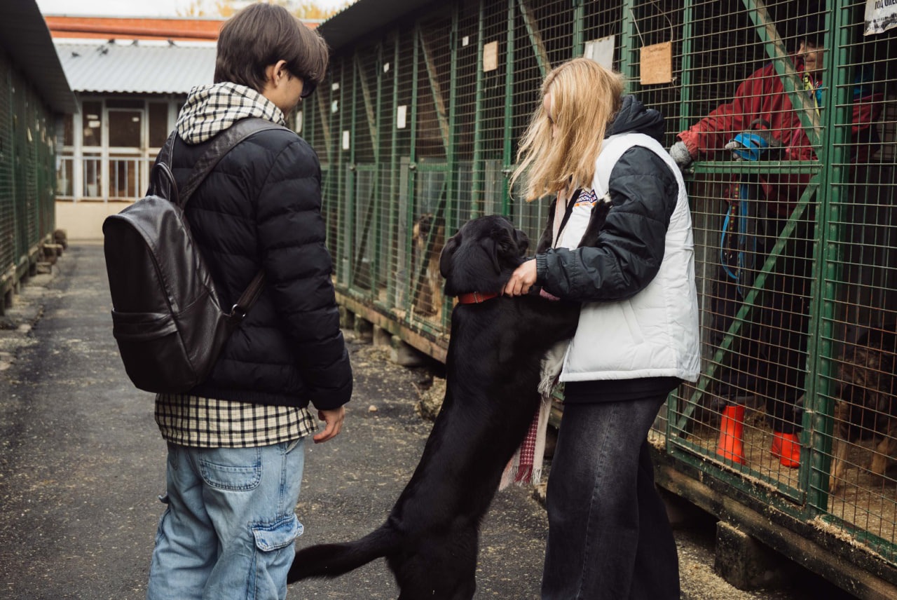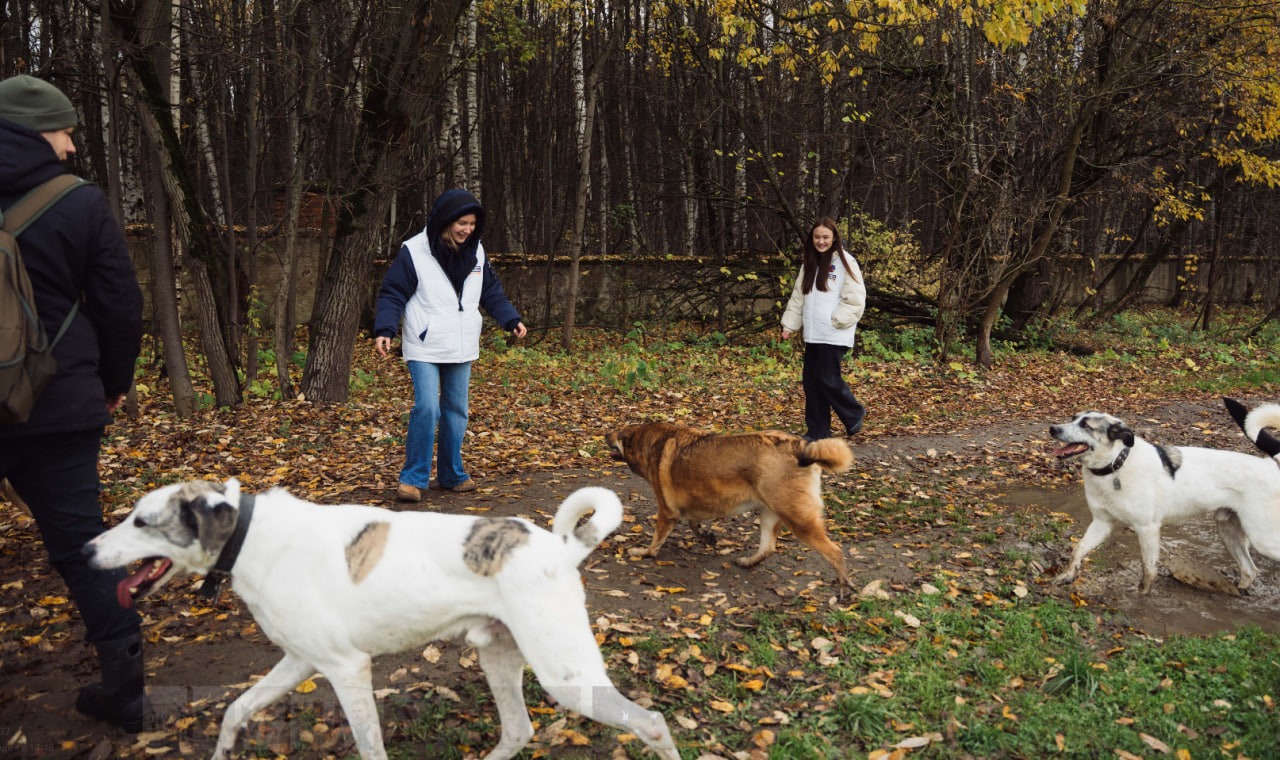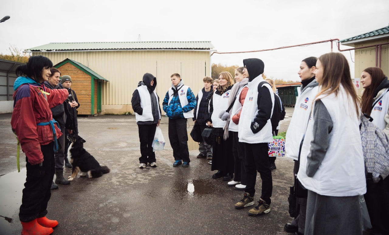 Пока одни студенты помогали с уборкой территории, другие отправились на долгожданную прогулку с собаками. Для многих подопечных приюта такие минуты общения с людьми – редкая и ценная радость.